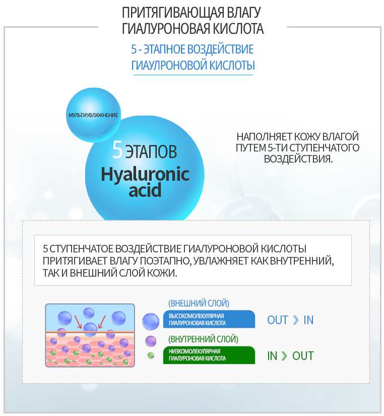 - Гиалуроновая кислота (Hyaluronic acid) - притягивающая влагу гиалуроновая кислота насыщает кожу влагой. Высокомолекулярная гиалуроновая кислота удерживает влагу во внешнем слое кожи. Низкомолекулярная гиалуроновая кислота насыщает влагой внутренние слои кожи.